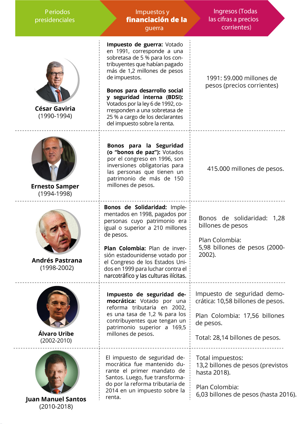 Otro elemento a tener en cuenta es el constante apoyo a la institucionalidad que el sector empresarial ha mantenido durante largo tiempo al enfrentar los retos y peligros del conflicto armado. Esto ha traído un corolario a nivel fiscal: el pago de tributos destinados a fortalecer la seguridad. Por consiguiente, los gobiernos han creado cargas impositivas orientadas a fortalecer la fuerza pública, y siempre los empresarios han hecho su aporte –se destaca que este ha significado el principal componente de lo recaudado, muy por encima del monto pagado por las personas naturales–. Con diferentes denominaciones, casi siempre en la forma de bonos, los gobiernos de Gaviria, Samper, Pastrana y Uribe –consecutivamente– introdujeron en la tributación cargas que recaían sobre todo en las empresas: bonos de seguridad, para el desarrollo social y la seguridad interna, de paz, de solidaridad e impuesto de seguridad democrática.