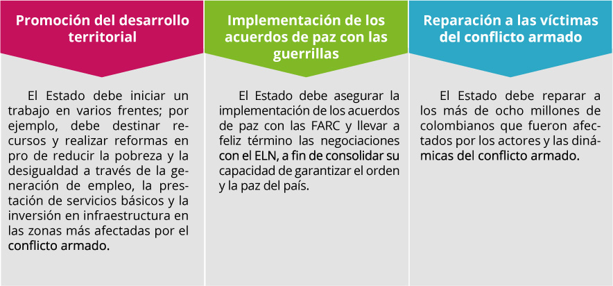 Una guerra debilita al Estado a tal punto que lo imposibilita para brindar los servicios básicos que requiere la población, tales como salud, educación, vivienda, transporte y justicia, entre otros. Por eso, ante el fin del conflicto armado, se hace necesario recuperar la capacidad estatal de ofrecer estos servicios, a la vez que se interviene en las causas de las desigualdades sociales y económicas que afectan al país.